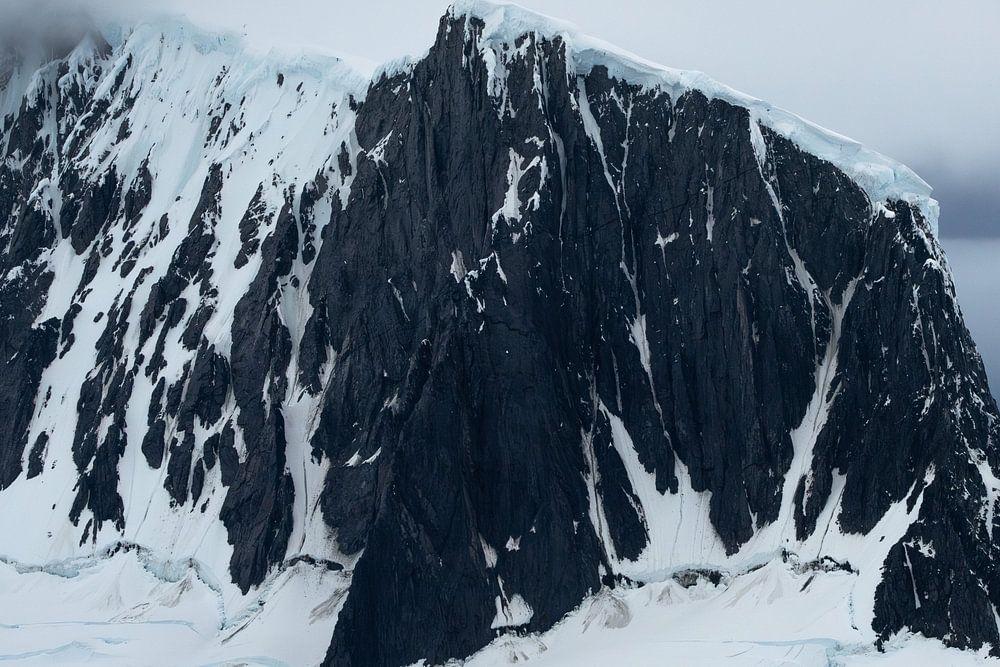 Die Komposition war interessant wegen der Wolke, die auf dem Gipfel des Berges zu ruhen scheint. Das Foto wurde von einem Expeditionsschiff in der Antarktis aus aufgenommen.
