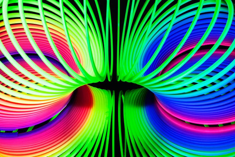 Een verbeelding van een wormgat. En in feite is het ook een worm: het is een speeltje, een gekleurde spiraal die van de trap kan stuiteren en op een spiegel dit beeld oplevert.