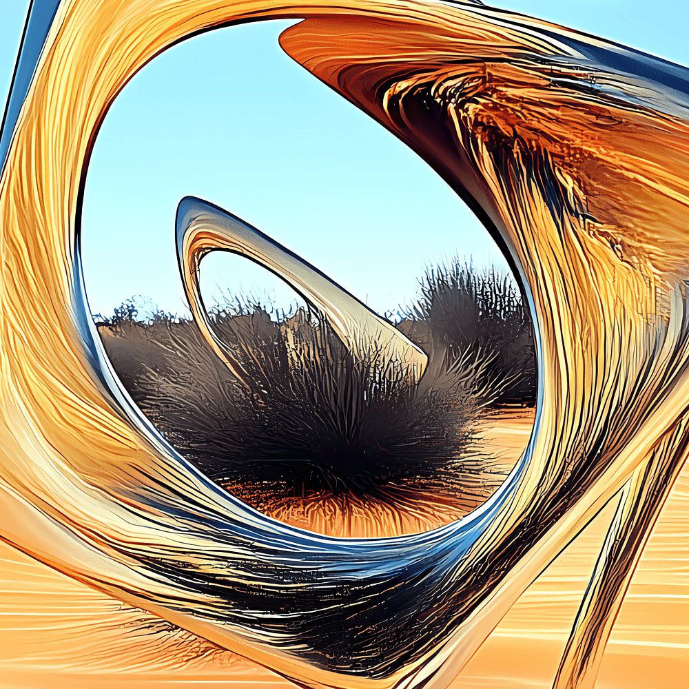 „Wüstenechos des chromatischen Tores“ fängt einen Moment ein, in dem die Realität ihren Griff zu lockern scheint und reine Geometrie atmen lässt. Metallische Formen – teils Skulptur, teils Trugbild – schweben über sonnenverbranntem Sand und biegen die Hitze der Wüste zu geschmolzenen Reflexionen. Die Formen wirken wie Relikte aus einer…