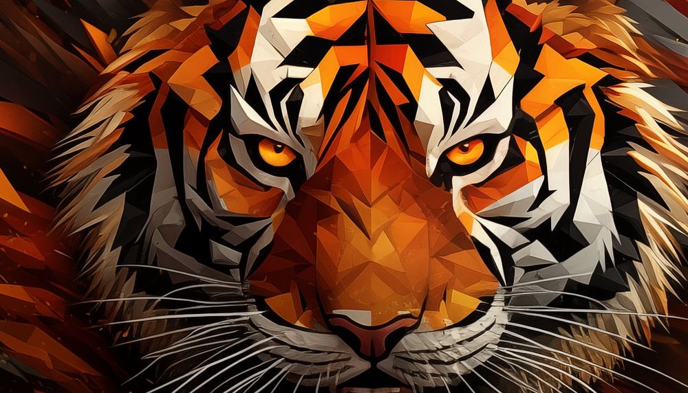 Abstraktes Panoramagemälde eines wütenden Tigers mit einem schönen und einzigartigen Stil. Mit schönen Farbtönen und einem einzigartigen Design ist dies ein stilvoller Fotodruck, der in jedem Raum gut aussieht. 100% einzigartig und originell!