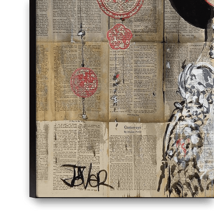 Dieses Werk ist Teil der Serie Asia, die in den letzten zehn Jahren mit Tusche und Gouache unter Verwendung von Collageelementen auf alten Buchseiten entstanden ist.