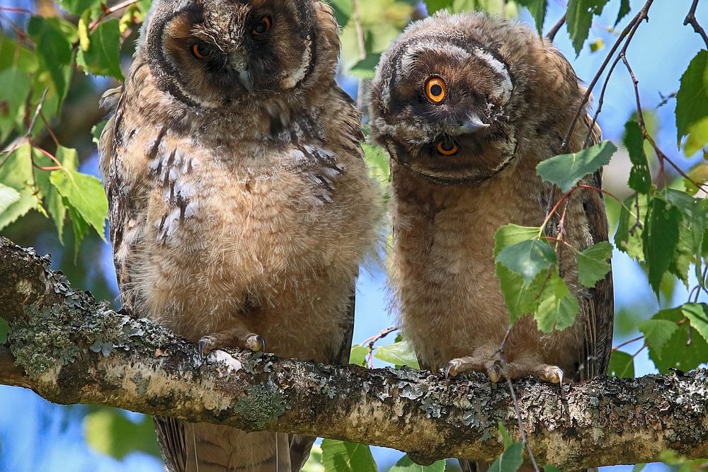 Junge Waldohreulen (Asio Otus) sitzten im Baum, Deutschland
