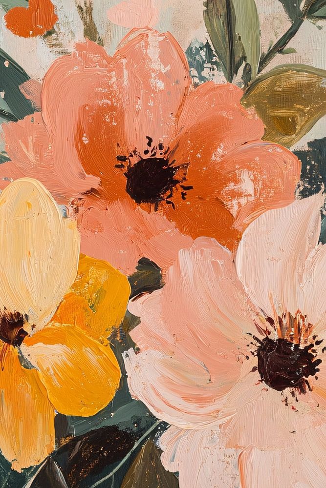 Dieses schöne Kunstwerk zeigt ein impressionistisches Blumendesign mit weichen Tönen von Lachsrosa, Gelb und Grün. Die Pinselstriche sind locker und ausdrucksstark und schaffen eine warme, einladende Atmosphäre. Dieser Stil passt perfekt in jeden Raum, dem Sie einen Hauch von Natur und Eleganz verleihen möchten. Das Design ist ideal für das Schlafzimmer oder das Esszimmer, es strahlt Ruhe aus und zieht mit seiner subtilen und doch lebendigen Farbpalette die Aufmerksamkeit auf sich. Ein perfektes Stück für Liebhaber klassischer und zeitloser floraler Kunst.
