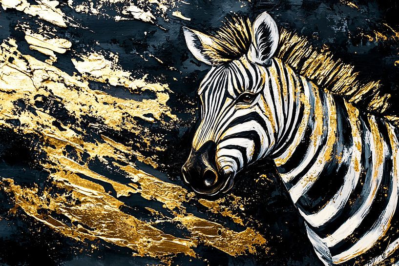Bestelle dieses Landschafts-Wandbild Zebra-Porträt mit goldenen Akzenten von Imperial Art House als Reproduktion auf Leinwand, Alu-Dibond, als Poster, Fototapete oder Acrylglasbild.