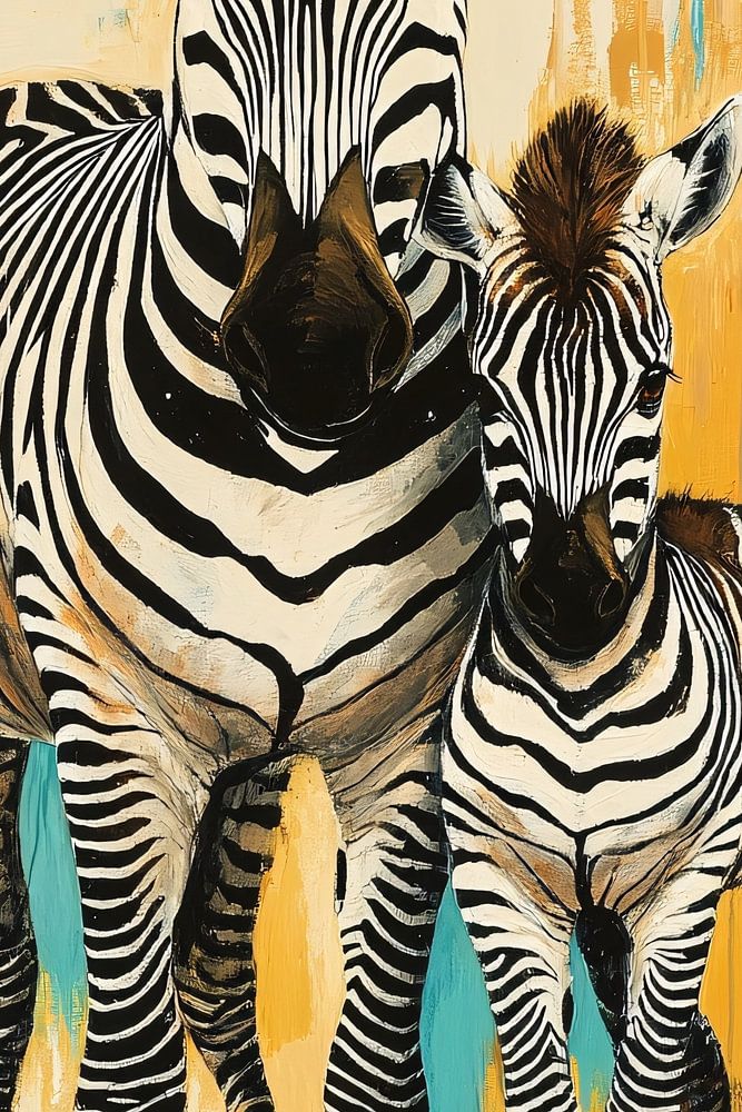 Dieses wunderschöne Kunstwerk zeigt ein Zebra mit seinem Jungen in einem einzigartigen und farbenfrohen Stil, der eine Mischung aus Abstraktion und Realismus ist. Die dynamischen Pinselstriche und die warmen Beige- und Brauntöne, kombiniert mit auffälligen blauen Akzenten, bilden ein auffälliges und harmonisches Ganzes. Ideal für die Dekoration eines Wohn- oder Esszimmers, um einen Hauch von Natur und Stil in Ihr Interieur zu bringen. Eine perfekte Wahl für Tierliebhaber und Kunstfreunde, die modernes Design lieben.
