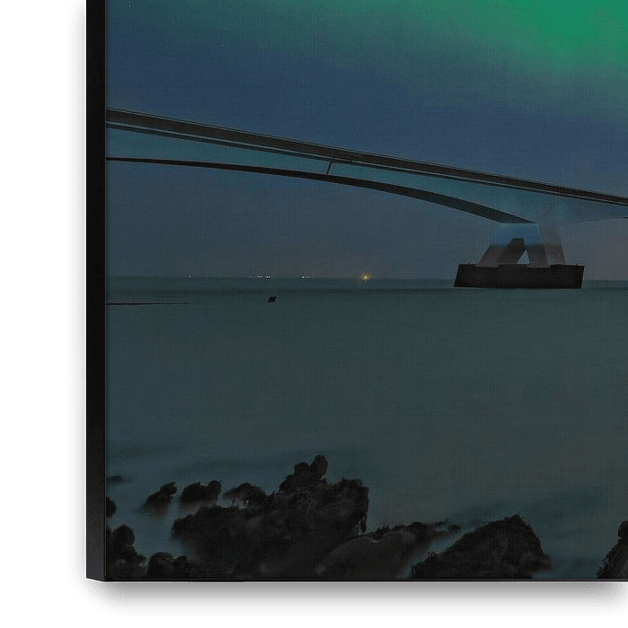 Bestelle dieses Landschafts-Wandbild Zeelandbrug mit spektakulären Nordlichtern (grün und magenta) von Lennart Verheuvel als Reproduktion auf Leinwand, Alu-Dibond, als Poster, Fototapete oder Acrylglasbild.