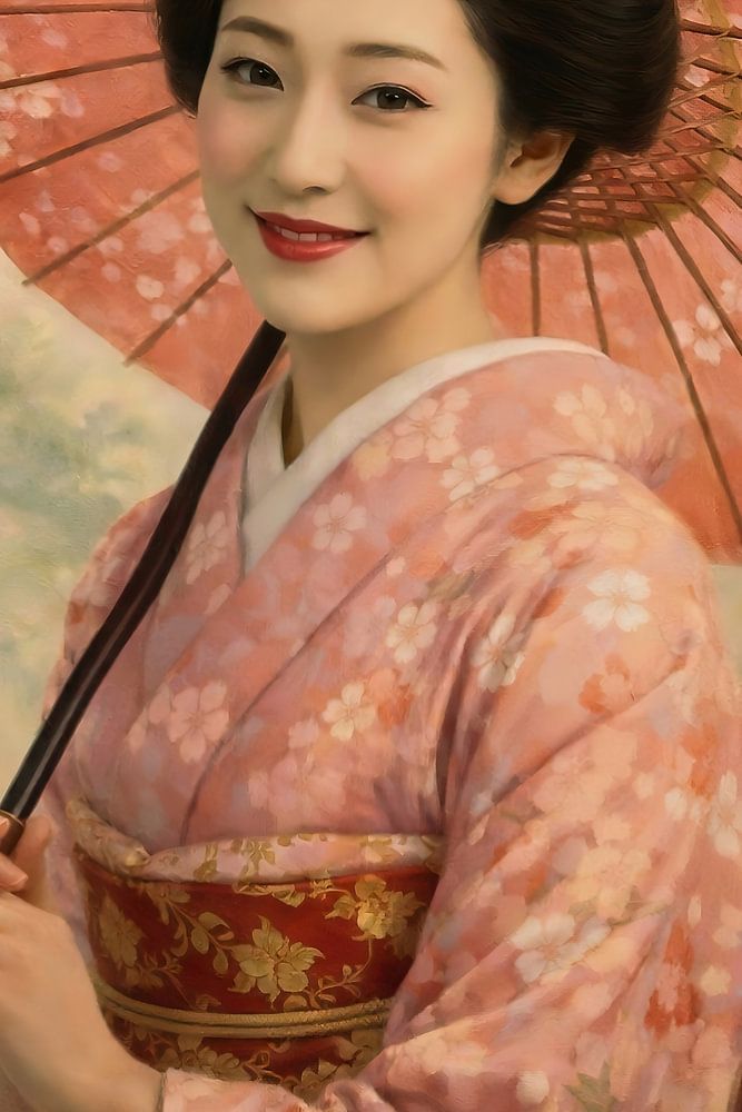 Dies ist ein lebendiges und farbenfrohes Porträt einer traditionellen japanischen Geisha, gemalt in einem künstlerischen, impressionistischen Stil. Die Frau hat einen gelassenen Gesichtsausdruck, porzellanartige Haut und zartes Make-up. Sie trägt einen rosa Kimono mit komplizierten Blumenmustern und eine hochgesteckte Frisur, die mit…