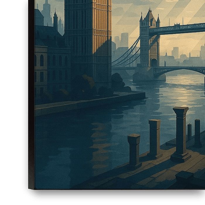 Dieses Kunstwerk zeigt die ikonische Skyline von London, England, in einem kühnen Art-Deco-Reiseposter-Stil. Mit dem Big Ben und der Tower Bridge unter einem dramatischen Himmel verbindet die Szene architektonische Erhabenheit mit atmosphärischem Charme. Lichtstrahlen brechen durch die Wolken und werfen Reflexionen auf die Themse, die…