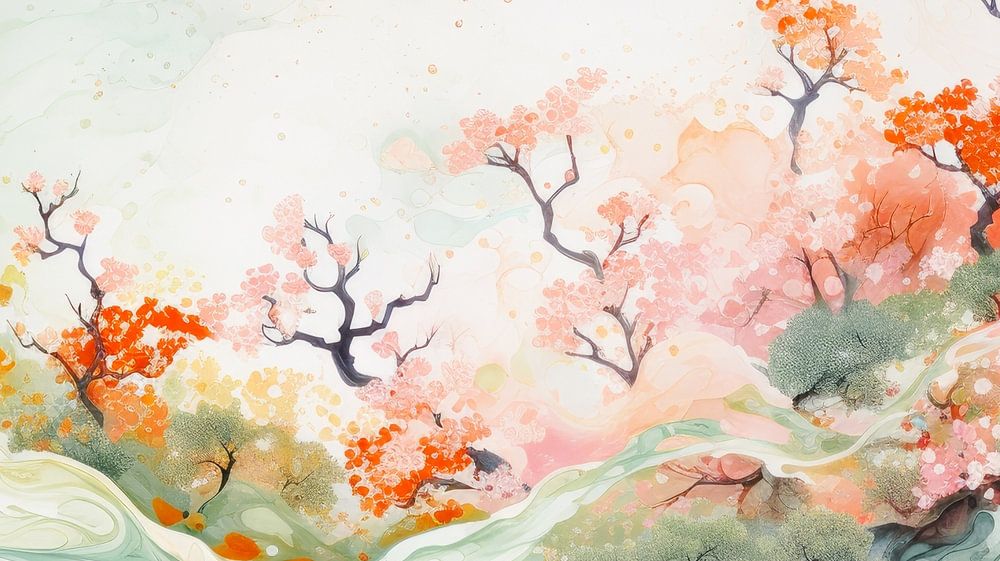 Das Kunstwerk wurde mit Tuscheklecksen in Aquarellfarbe erstellt, was ihm ein organisches und spontanes Aussehen verleiht. Diese Tupfen bilden die Grundlage der Landschaft und lassen zufällige Konturen entstehen, die die Vorstellungskraft des Betrachters anregen Die Farbpalette besteht aus weichen, beruhigenden Tönen.