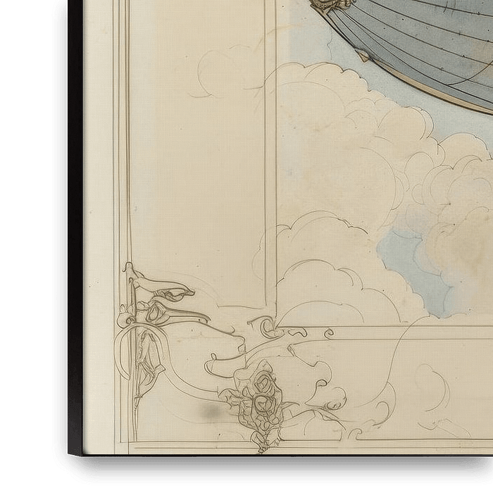 Die wunderschöne Illustration eines imposanten Zeppelins, der in den Wolken schwebt, strahlt Geheimnis aus. Eine zeitlose Szene, die Staunen und Fernweh weckt und einen Hauch von Nostalgie vermittelt.