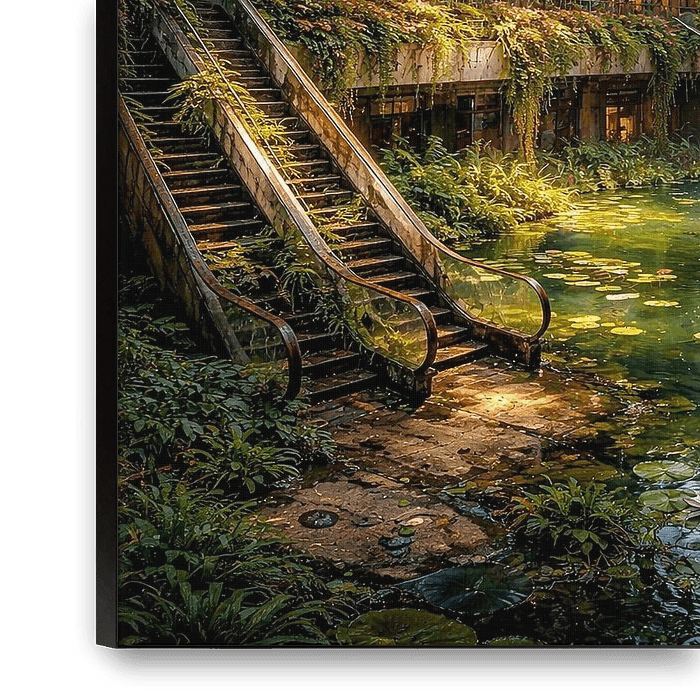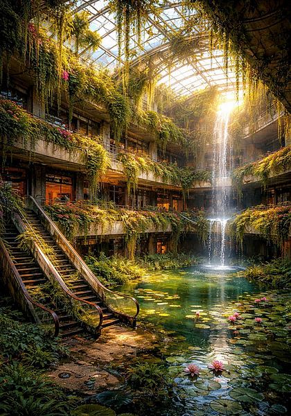 Dieses beeindruckende Bild zeigt eine surreale, von der Natur zurückeroberte Architektur, die an ein verlassenes Einkaufszentrum oder ein futuristisches Gewächshaus erinnert. Es handelt sich um ein digitales Kunstwerk, das mit künstlicher Intelligenz erstellt wurde.