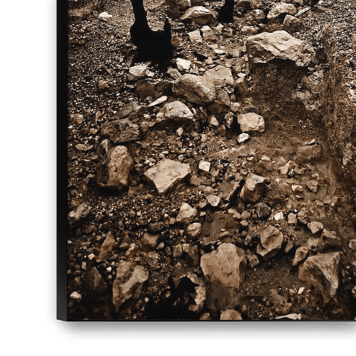 Diese Fotografie enthüllt eine besonders raue und kahle Landschaft im Herzen des Vulkanmassivs Kawah Ijen. Der Boden erscheint zerklüftet, wie von alten Strömen, gewaltigen Abflüssen und aufeinanderfolgenden Erosionen ausgehöhlt. Die verstreuten Steine zeugen von der Gewalt des Berges. Zahlreiche verbrannte Baumstümpfe, die vollständig geschwärzt sind, scheinen wie Kohlefinger aus dem Boden zu ragen, die sich in den Himmel strecken. Sie sind die Überreste von Sträuchern und Vegetation, die irgendwann in die extreme Hitze, die Schwefelemissionen oder sogar die natürlichen Brände geraten sind, die in diesem vulkanischen Gebiet vorkommen. Die Atmosphäre ist schwer, fast dramatisch, verstärkt durch einen verschleierten Himmel, in dem das Licht sanft streut und der gesamten Szene einen Ocker- und Braunton verleiht. Am Horizont erhebt sich ein vulkanischer Hang, der an die aktive und sich verändernde Natur des Ijen erinnert. Dieses Bild erinnert an ein Land im ständigen Übergang, eine Szenerie, in der die Natur durch die Kräfte des Vulkans gleichzeitig geformt, zerstört und gestaltet wird, und in die das Leben trotz allem fast immer am Ende zurückkehrt.