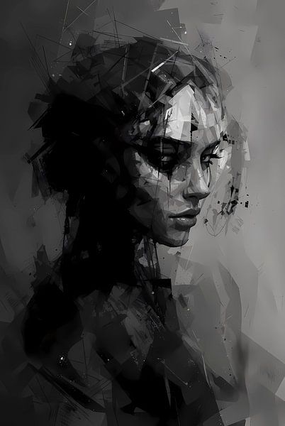 Ein eindringliches und rohes Kunstwerk, in dem ein weibliches Profil in geometrische Scherben und grobe Holzkohle-Texturen zersplittert. Das Zusammenspiel zwischen den detaillierten Gesichtszügen und dem abstrakten Chaos um sie herum erzeugt eine Spannung, die weiterhin fasziniert.
