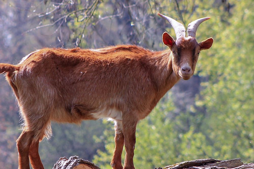 Ziege auf umgeknicktem Baumstamm