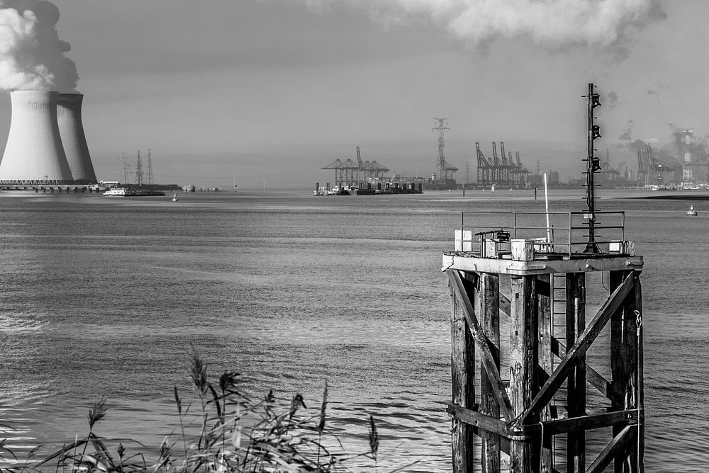 Blick auf die Kühltürme des Kernkraftwerks Doel im Hafen von Antwerpen.
