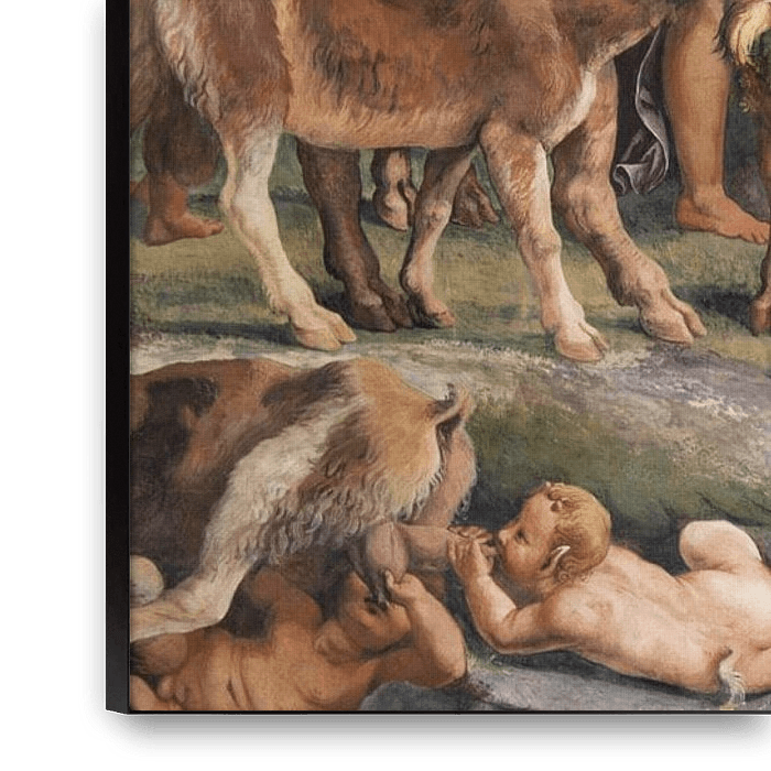 Die Szene, die sich um den Tisch an der Westwand entfaltet, zeigt eine Gruppe von Satyren, die sinnlichen Mädchen nachjagt. Die gemalten Figuren treten in einen Dialog mit den Gästen, die an den von Federico organisierten Banketten teilgenommen haben. Jahrhundert, die hier bewirtet wurden, wurde eine bildliche Darstellung der Freuden…