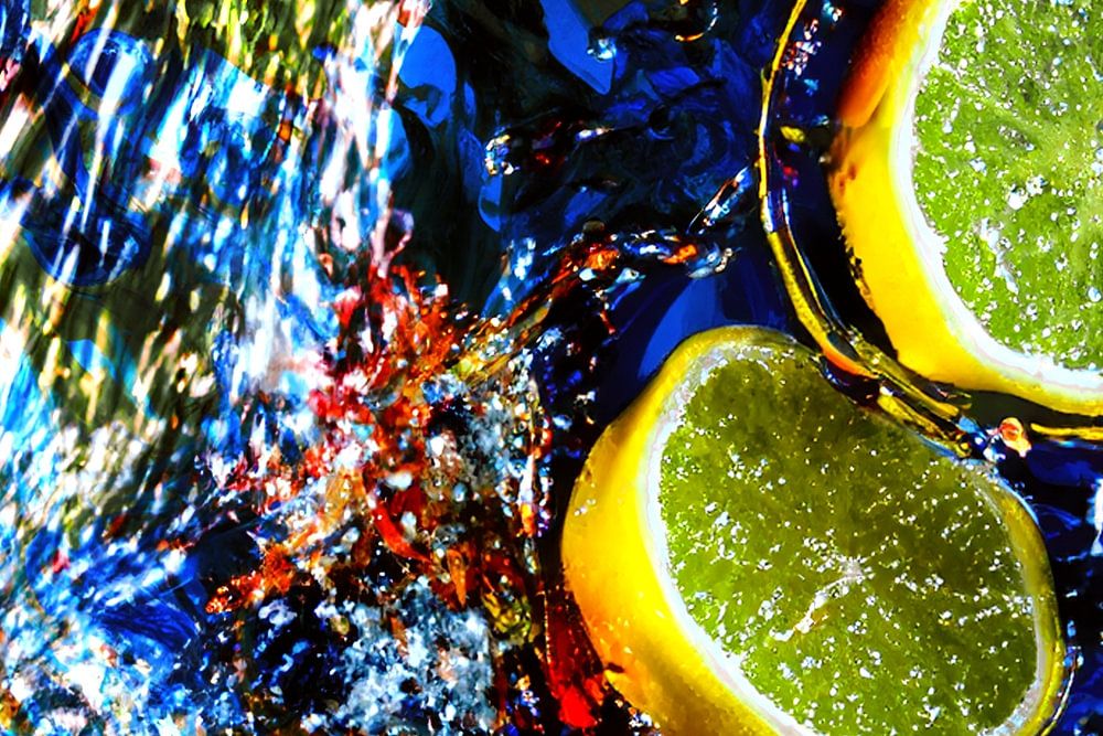 Zitronen im Wasserstrahl wurde von Photoart-Naegele 2024 fotografiert und mit Hilfe künstlicher Intelligenz verarbeitet. ( Nikon Z50 )