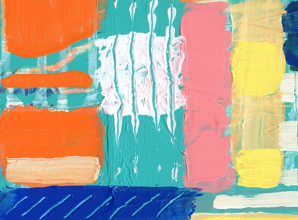 Abstrakte Malerei von gemalten Formen und Strukturen, die miteinander interagieren. Komposition, die Bewegung suggeriert. Die Hauptfarben sind Blau, Off White, Weiß, Gelb, Rosa, Orange und Türkis.