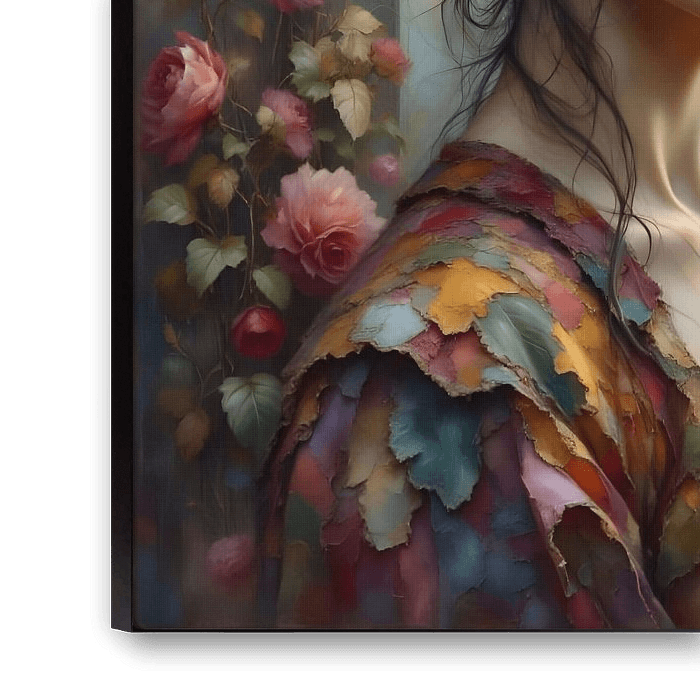 Eine Frau sitzt ruhig da, ihr Haar ist mit zarten Blüten geflochten, und sie blickt zum Fenster, wo die Sonne über einem ruhigen Fluss am Horizont verschwindet. Der Raum um sie herum spiegelt die Gelassenheit draußen wider, erfüllt vom sanften Duft der Blumen und getaucht in den sanften Schein des warmen Lichts. Jedes Blütenblatt scheint die Farben des Sonnenuntergangs widerzuspiegeln und eine Brücke zwischen dem Innenraum und der Außenwelt zu schlagen. In ihrer Stille liegt ein Gefühl der ruhigen Reflexion, ein Innehalten, das die flüchtige Schönheit der Natur und die zarten Momente der Selbstbeobachtung feiert. Die Zeit scheint hier stillzustehen, wo Licht, Farbe und Leben in sanfter Harmonie zusammenfließen. Die Szene ruft ein Gefühl der Ruhe hervor, einen Raum, in dem die Gedanken frei schweifen können, umarmt von dem zarten Zusammenspiel der Blumenfülle und dem verblassenden goldenen Himmel. Es ist eine stille Feier der Schönheit, die sowohl gesehen als auch gefühlt wird, in der sich die natürliche Welt und die menschliche Präsenz in einem ruhigen, leuchtenden Moment verflechten.