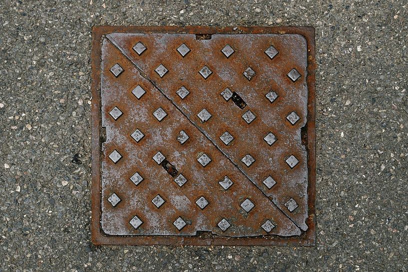 Quadratischer Metallrohrdeckel mit diagonaler Aufteilung und rutschfesten Noppen. Rost, Abnutzung und das strenge Raster machen dieses funktionale Objekt zu einem grafischen Bild.