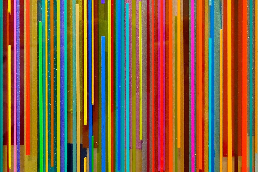 Abstrakte Kunst aus bunten vertikalen Linien. Der Hintergrund besteht aus farbenfrohen vertikalen Streifen, die ein kompliziertes Muster bilden und einen lebendigen und dynamischen visuellen Effekt erzeugen. Jeder Streifen hat seine eigene einzigartige Farbpalette, die der Komposition Tiefe verleiht.