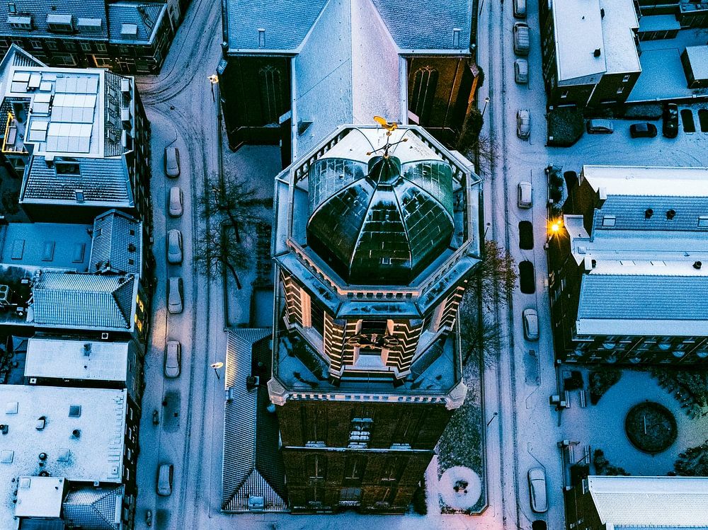 Der Peperbus-Turm der römisch-katholischen Kirche Onze Lieve Vrouwe ten Hemelopneming-basilica in Zwolle erhebt sich über die schneebedeckten Dächer im Stadtzentrum. Der Peperbus genannte Kirchturm ist einer der höchsten und bekanntesten Kirchtürme der Niederlande.