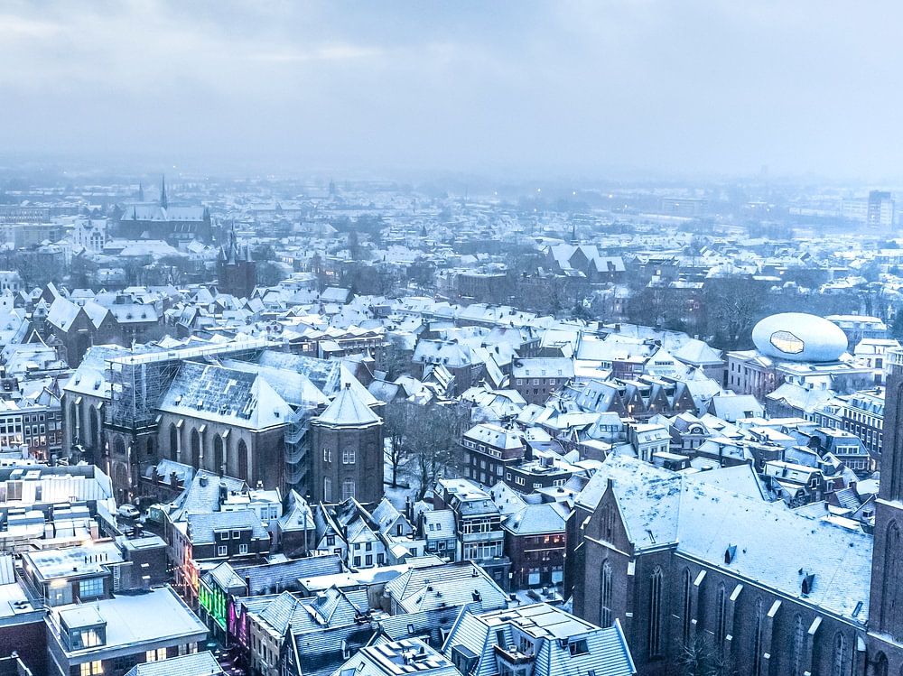 Der Peperbus-Turm der römisch-katholischen Kirche Onze Lieve Vrouwe ten Hemelopneming-basilica in Zwolle erhebt sich über die schneebedeckten Dächer im Stadtzentrum. Der Peperbus genannte Kirchturm ist einer der höchsten und bekanntesten Kirchtürme der Niederlande.