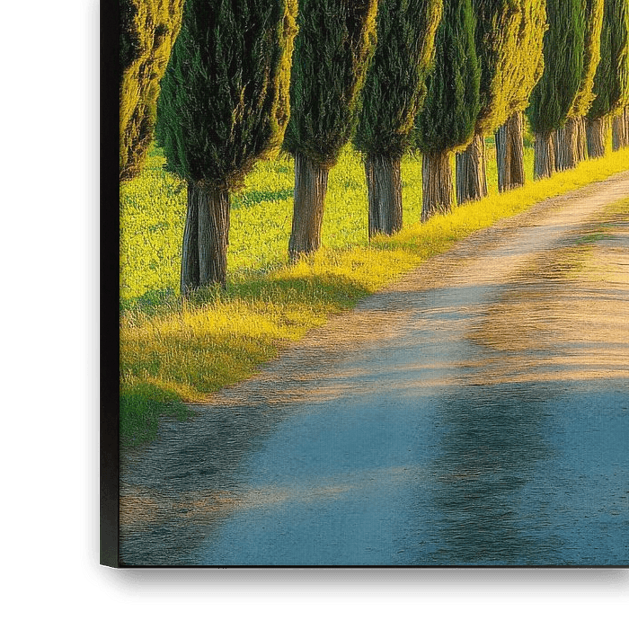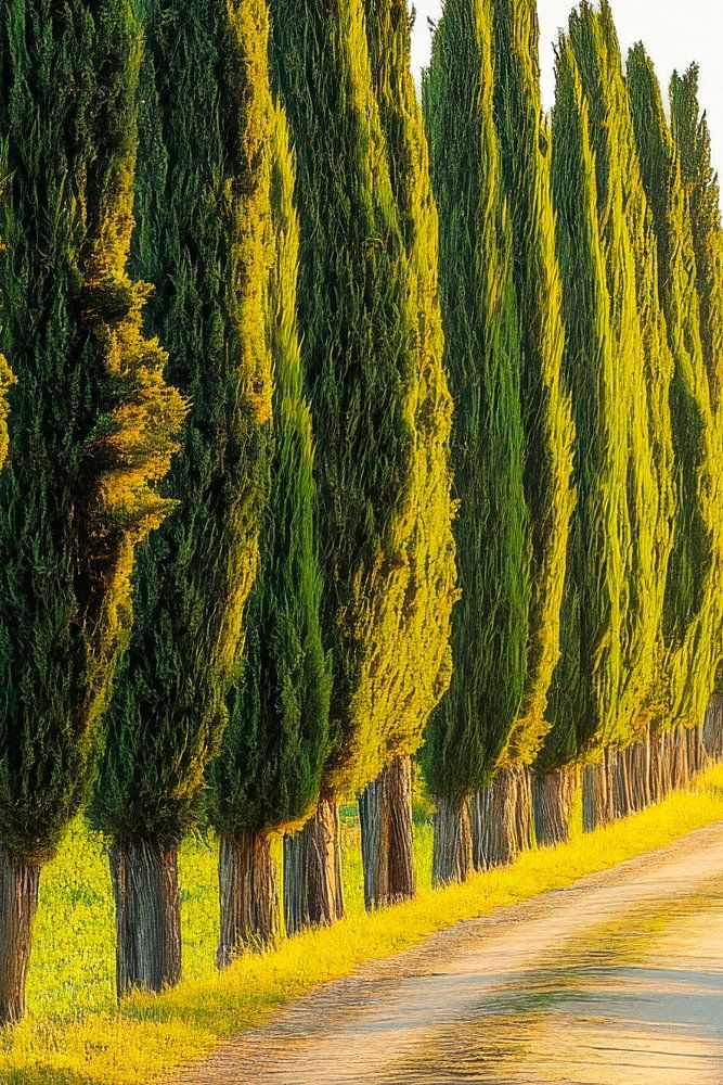 Ein malerischer Weg schlängelt sich sanft zwischen hoch aufragenden Zypressen, deren lebhaftes Grün im Sonnenlicht erstrahlt. Die Bäume stehen wie vertrauensvolle Wächter entlang des Pfades und laden ein, die Ruhe der Landschaft zu genießen. Der sanfte Verlauf des Weges verspricht, zu neuen Entdeckungen und inspirierenden Momenten zu führen.