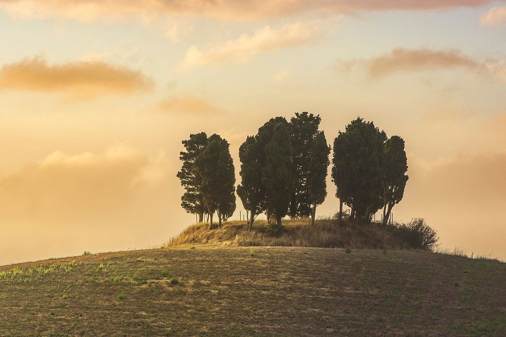 This photograph captures the essence of the Tuscan countryside, featuring a group of iconic cypress trees standing atop Poggio Pinzuti Hill, near Orciano Pisano, bathed in the warm light of a sunset.
