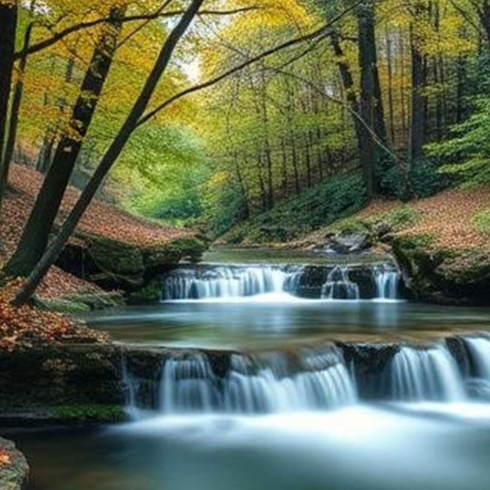 ein langsam fließender, blaugrüner Wasserfall im Wald mit grünen Bäumen und Licht in der Naturlandschaft.