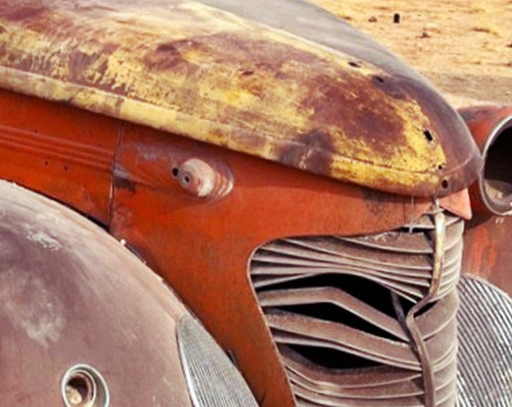 Nahaufnahme mit einem amerikanischen Oldtimer Wrack in der Wüste