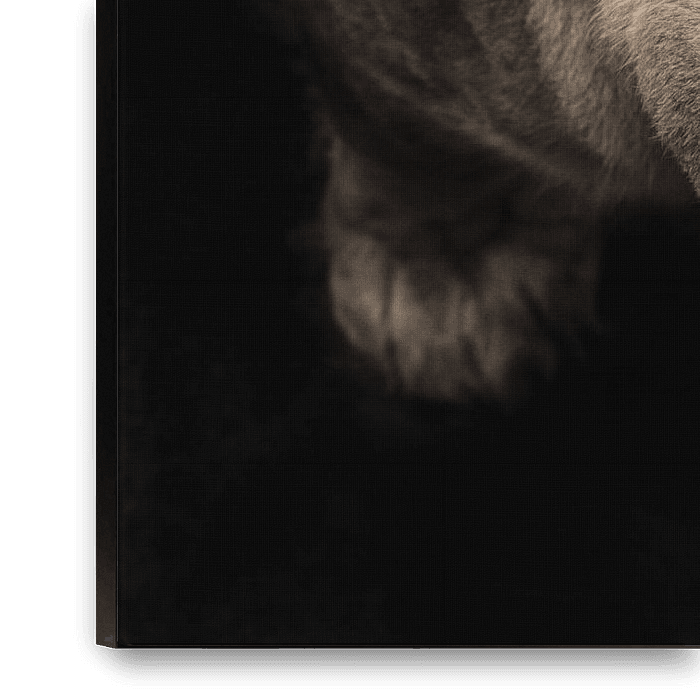 Bestelle dieses Löwen-Wandbild eine weibliche Löwin von unten nach oben, die Augen schmachtenden braun-ebenholzigen Blick auf den B von Michael Semenov als Reproduktion auf Leinwand, Alu-Dibond, als Poster, Fototapete oder Acrylglasbild.