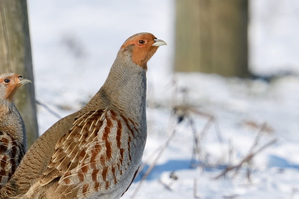 Ein Rebhuhnpaar sucht in der Nähe eines Zaunpfahls Deckung und Schutz . Die weithin offene Landschaft macht den beiden das Leben schwer. Im Schnee funktioniert die ansonsten so gute Tarnung ihres reich strukturierten Gefieders nicht mehr. Da heißt es aufzupassen. Die Henne hält sich dazu dicht bei dem Hahn, der mit hochgerecktem Kopf die Umgebung überwacht.