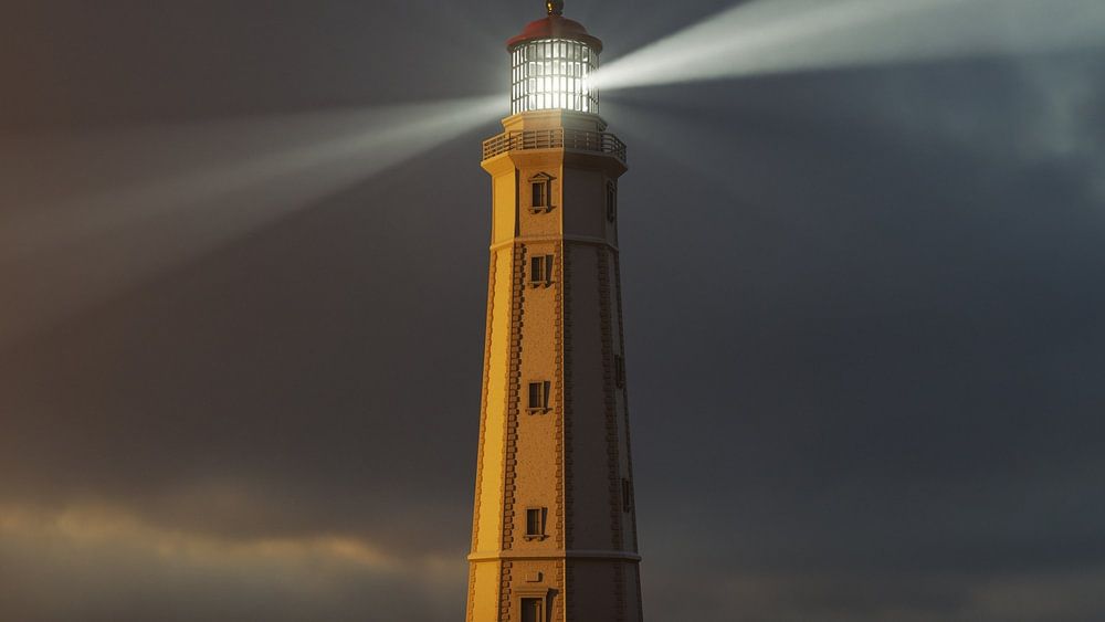 A beautiful lighthouse at sunset with light rays. 3D illustration