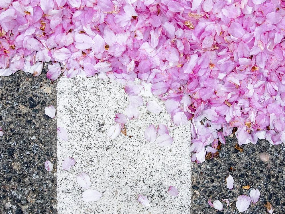 Rosafarbene Blüten hat der Wind auf dem Asphalt zusammen geweht.