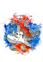 Ein poetisches Spiel zwischen Himmel und Meer: Dieses einzigartige Aquarell vereint einen majestätischen Wal mit einer fantasievollen Welt aus Leuchtturm, Vögeln, Booten und Himmelselementen.