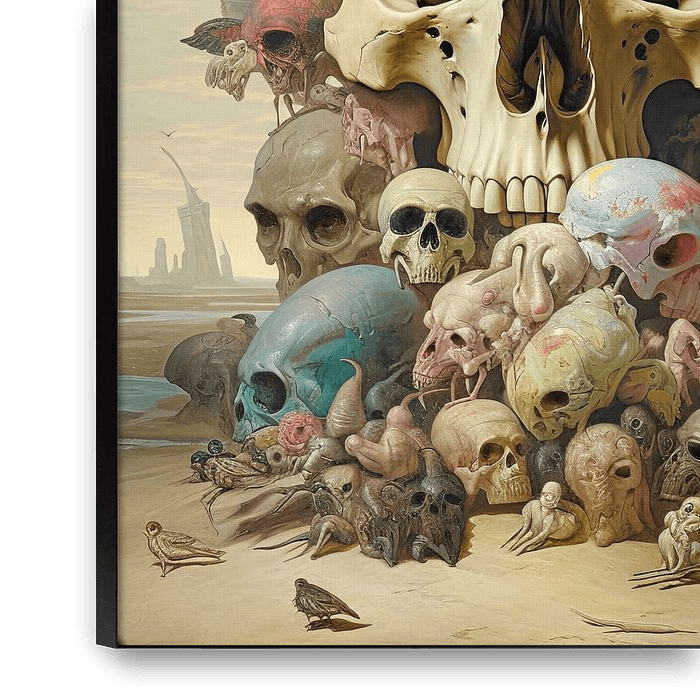Im Tentrum des Bildes ist ein großer menschlicher Schädel. Um ihn herum liegen verschiedene, skurile und bunte Schädel. Auf dem Schädel und im Vordergrund sind verschiedene phantastische Insekten und Tierarten. Die gesamte Szene befindet sich in einer weiten Ebene mit Wasser und einigen phantastischen Bauwerken im Hintergrund,