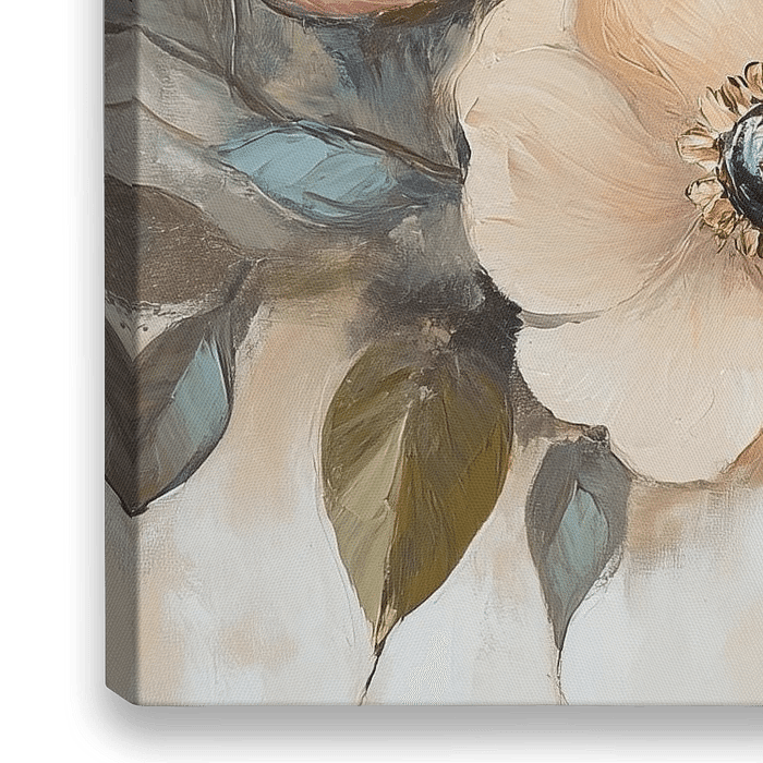 Blumenpastellbilder | Pastellblumen - Dieses Blumenbild zeigt eine lebendige Komposition großer, gemalter Blumen in Pastelltönen von Rosa, Blau und Beige mit auffälligen, dunklen Herzen und weichen, grünen Blättern auf neutralem Hintergrund.