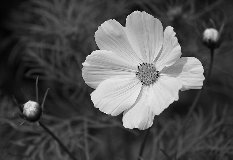 Bestelle dieses Blumen-Wandbild Cosmea in Schwarz und Weiß. von Jose Lok als Reproduktion auf Leinwand, Alu-Dibond, als Poster, Fototapete oder Acrylglasbild.