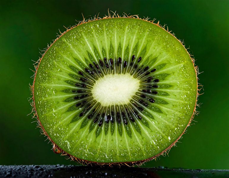 Detaillierte Nahaufnahme einer frischen Kiwi scheibe mit Tropfen