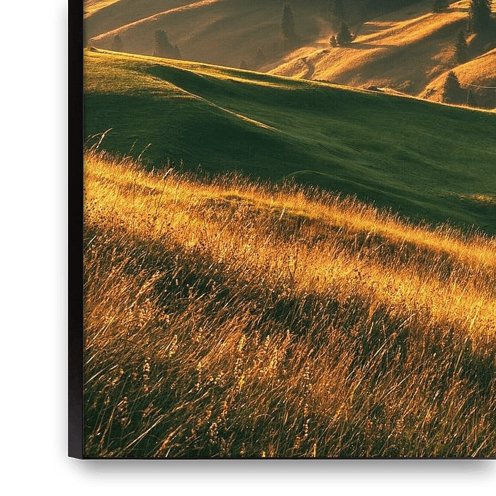 Bestelle dieses Landschafts-Wandbild Ein sonniger Morgen auf der Seiser Alm von Daniel Gastager als Reproduktion auf Leinwand, Alu-Dibond, als Poster, Fototapete oder Acrylglasbild.