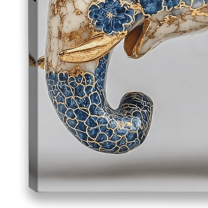 Bestelle dieses moderne Wandbild Elefant in Delfter Blau und Gold auf weißem Marmorgrund von Gelissen Artworks als Reproduktion auf Leinwand, Alu-Dibond, als Poster, Fototapete oder Acrylglasbild.