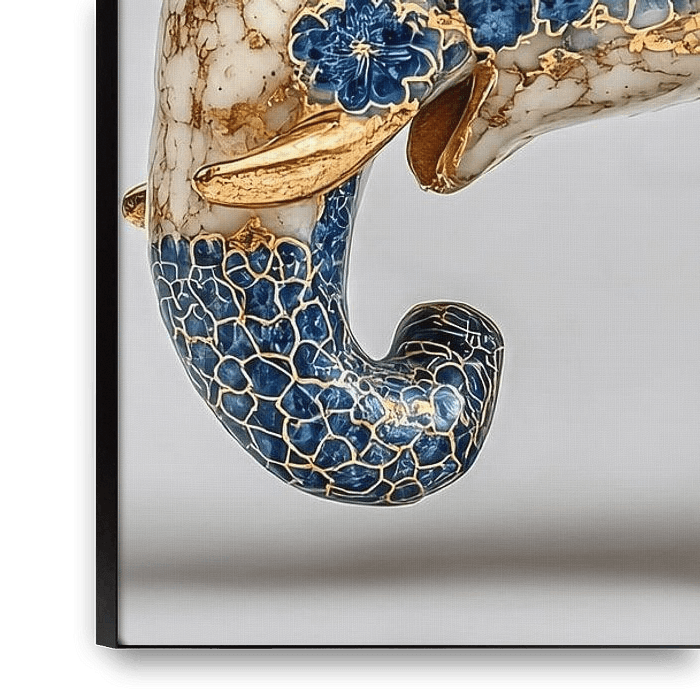 Über „Elefant in Delfter Blau und Gold auf weißem Marmorgrund“ von Gelissen Artworks