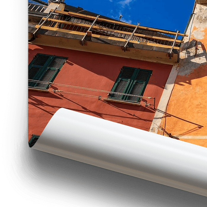 Bestelle das Foto Historische Gebäude in Riomaggiore an der Mittelmeerküste in von Rico Ködder als Reproduktion auf Leinwand, Alu-Dibond, als Poster, Fototapete oder Acrylglasbild.