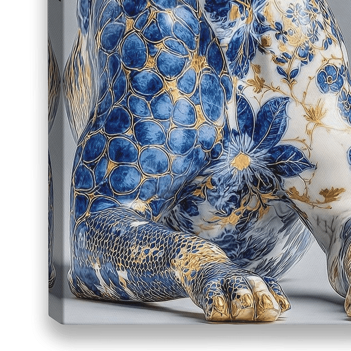 Bestelle dieses moderne Wandbild Hund in Delfter Blau und Gold auf weißem Marmorgrund von Gelissen Artworks als Reproduktion auf Leinwand, Alu-Dibond, als Poster, Fototapete oder Acrylglasbild.
