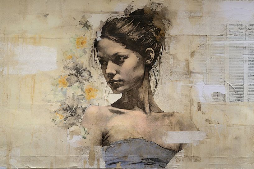 Iris Portrait - abstrakte Malerei / Mischtechnik gemalt. Schöner Kontrast zwischen anspruchsvollem Portrait und roher Collage/Maltechnik.