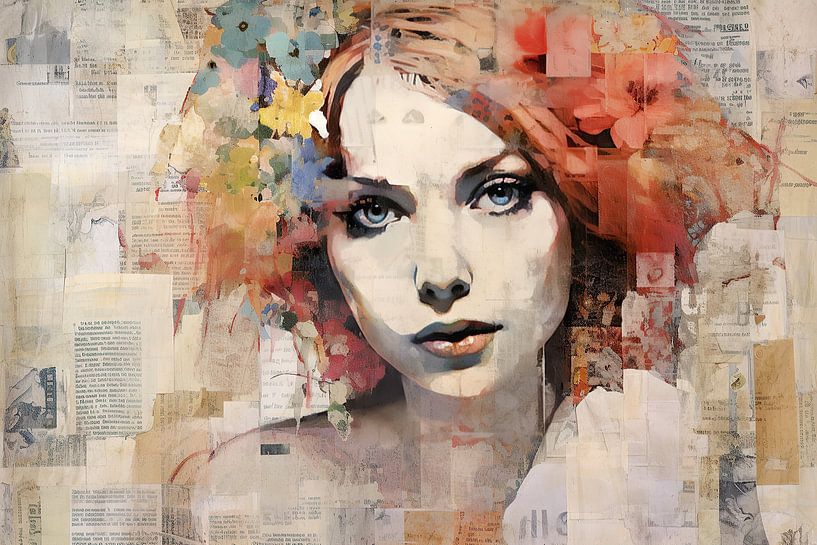 Iris Portrait - abstrakte Malerei / Mischtechnik gemalt. Schöner Kontrast zwischen anspruchsvollem Portrait und roher Collage/Maltechnik.