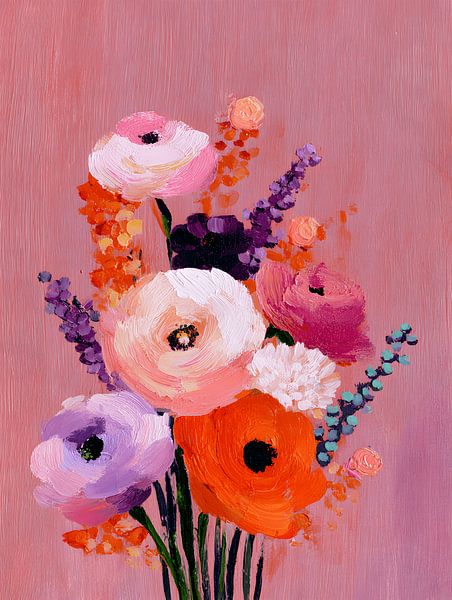 Ein kraftvolles und ausdrucksstarkes florales Werk mit auffälligen Farben und lockeren Pinselstrichen. Der rosafarbene Hintergrund sorgt für Zusammenhalt und Weichheit, während der Strauß selbst Energie und Charakter ausstrahlt.