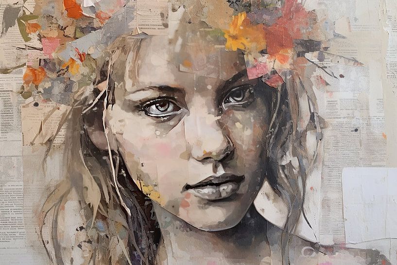 Liv Portrait - abstrakte Malerei / Mischtechnik gemalt. Schöner Kontrast zwischen anspruchsvollem Portrait und roher Collage/Maltechnik.