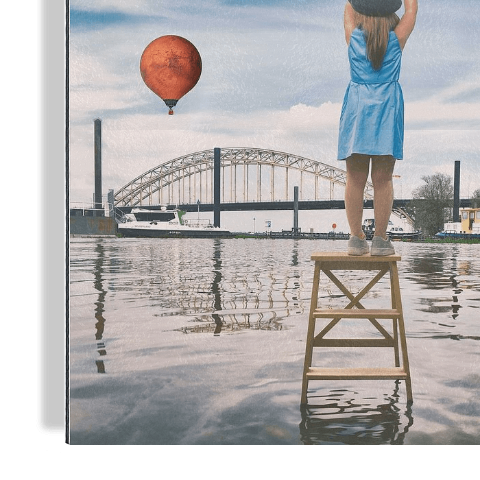 Bestelle das Foto Magische Szene an der Waalbrücke Nijmegen: verträumtes Mädchen mit Heißluftballons von Elianne van Turennout als Reproduktion auf Leinwand, Alu-Dibond, als Poster, Fototapete oder Acrylglasbild.